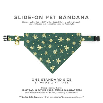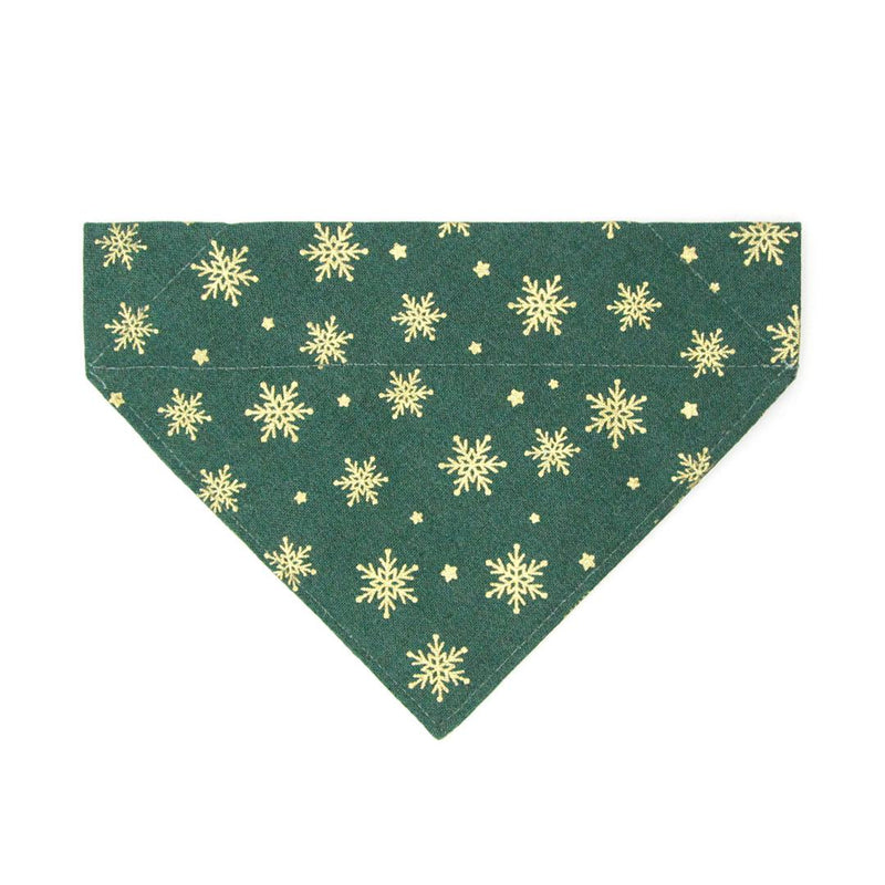 Holiday Cat Bandana - "Juniper" - Christmas Green & Gold Snowflake Bandana for Cat + Small Dog / Slide-On Over the Collar Bandana