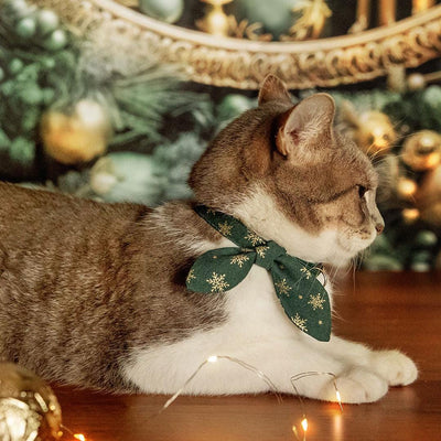 Holiday Cat Collar - "Juniper" - Green & Gold Snowflake Cat Collar / Christmas / Breakaway Buckle or Non-Breakaway / Cat, Kitten + Small Dog Sizes
