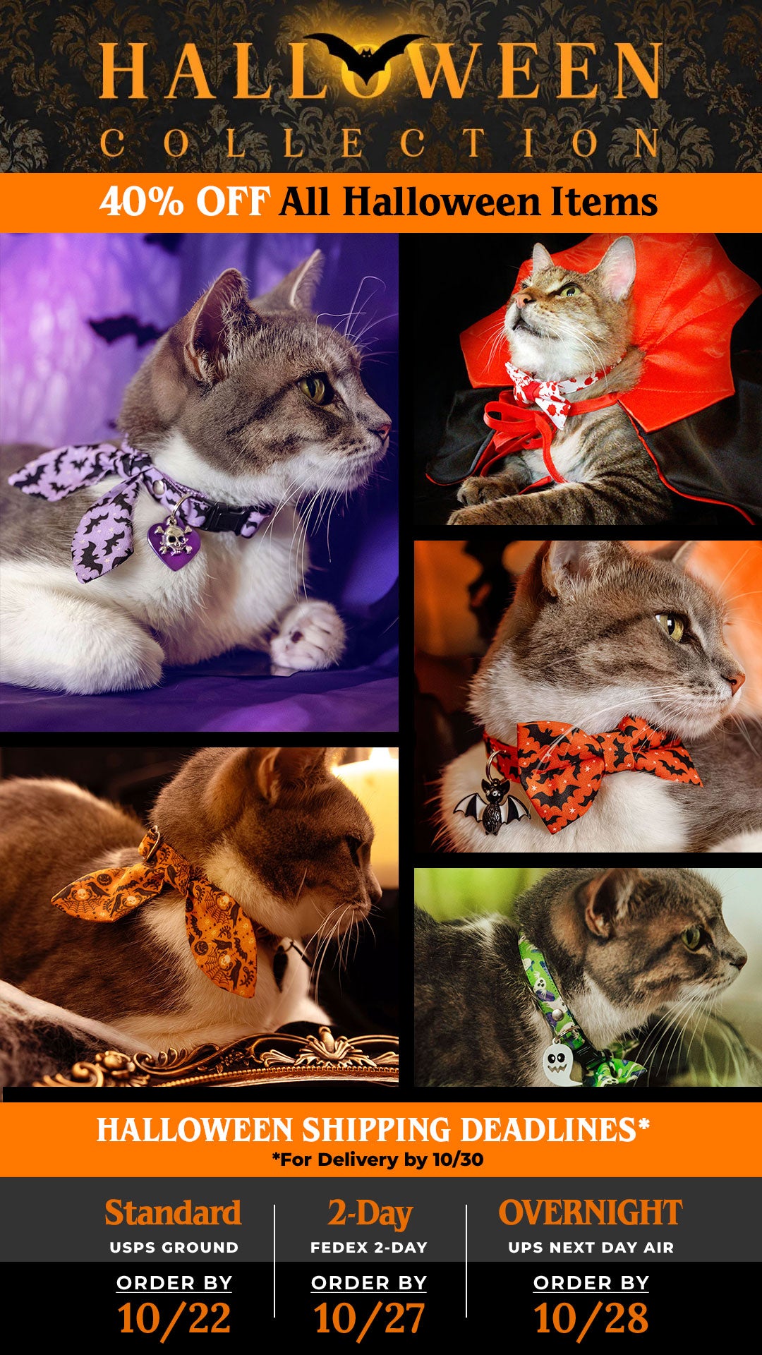Imagine a dashing Dracula with a collar, bandana, or bow tie covered with bats or a mysterious black cat sporting a collar where pumpkins abound.