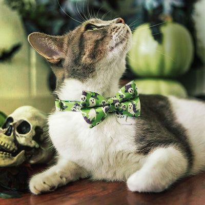 Cat Collar - "Ghostly Gathering" - Halloween Green Ghost Cat Collar / Haunted Graveyard, Cemetery, Skulls / Breakaway Buckle or Non-Breakaway / Cat, Kitten + Small Dog Sizes