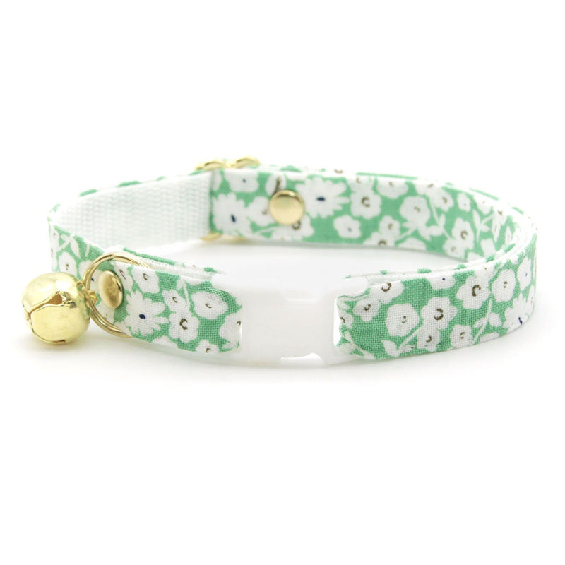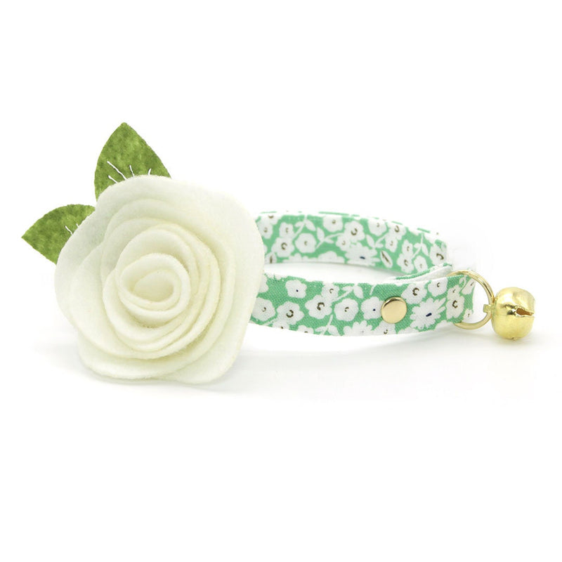 Cat Collar + Flower Set - "Apple Blossom" - Light Green Floral Cat Collar w/ Ivory Felt Flower (Detachable)