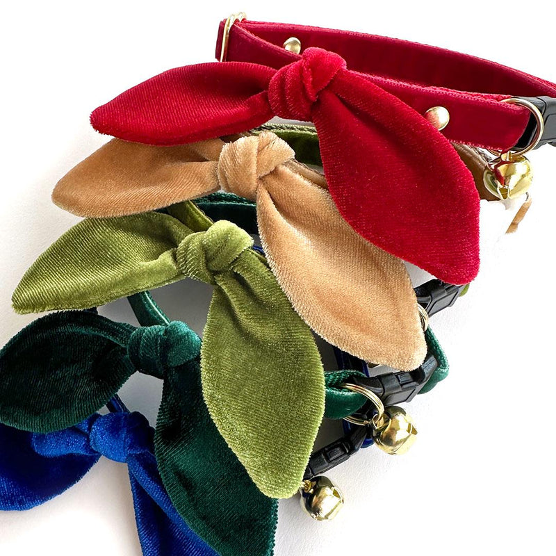 Cat Collar & Bunny Ear Bow Set - "Velvet - Leaf Green" - Chartreuse Green Velvet Cat Collar w/ Matching Bunny Bow Tie / Fall, Holiday, Wedding + Birthday / Cat, Kitten + Small Dog Sizes