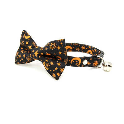Bow Tie Cat Collar Set - "Moonlight - Black" - Halloween Moon Cat Collar w/ Matching Bowtie / Night, Witchcraft, Magic, Stars / Cat, Kitten, Small Dog Sizes Sizes