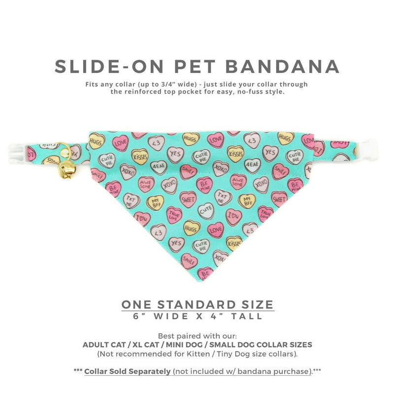 Pet Bandana - "Conversation Hearts - Mint" - Candy Heart Sayings Bandana for Cat + Small Dog / Valentine's Day / Slide-on Bandana / Over-the-Collar (One Size)