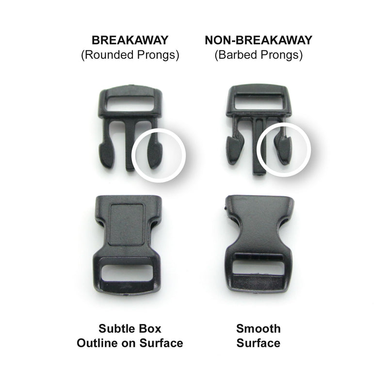 "Buckle Type" refers to the black or white standard plastic side-release clasp shown in all collar product photos in our store. On every collar product page, you will be given the option to select whether you prefer a "Breakaway" or "Non-Breakaway" plastic buckle clasp. Both types look the same as what you see in the photos — the difference has to do with the internal pronged mechanism, which makes them function differently. See the illustration below to compare the visual differences. Please Note: The details regarding the differences shown below will apply whether it's pertaining to a white or black buckle clasp: